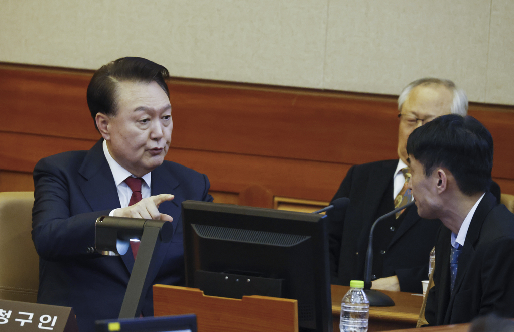 ▲因國會彈劾停職的韓國總統(tǒng)尹錫悅(左)23日赴憲法法院出席第4次庭審時與律師交談。(美聯(lián)社)