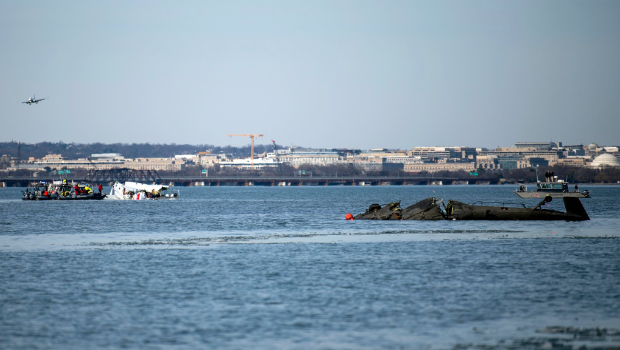 ▲美國航空(American Airlines)子公司PSA航空客機(jī)與黑鷹直升機(jī)空中相撞釀成67死,30日已找到客機(jī)上的2具黑盒子。圖為30日漂浮在河面上的客機(jī)與黑鷹直升機(jī)殘骸。(美聯(lián)社)
