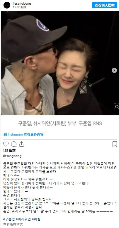 具俊曄友人擔心他恐難以承受喪妻之痛,南韓知名服裝設(shè)計師李相奉(???)曾在IG將和具俊曄私下對話曝光,李相奉原本以為是假新聞,因此立刻傳訊息及致電給具俊曄求證,“加油,這是真的嗎?現(xiàn)在沒事了嗎?”但具俊曄并未即時回覆,直到深夜才回傳訊息,表示看到簡訊已經(jīng)很晚了,并回覆“我盡力了”,李相奉也替他打氣:“俊曄加油,愿徐熙媛安息?!崩钕喾钐寡院軗木呖蠣顩r,因為他脆弱細膩的性格,現(xiàn)在應該太衝擊快瘋了,一想到他未來將面臨多少痛苦,除了叫他振作起來,實在沒有其他的話可以安慰他。