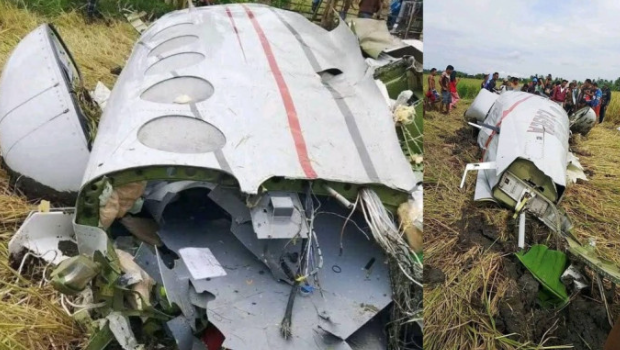 現(xiàn)場畫面顯示,小飛機似乎墜毀在一片田地,機身嚴(yán)重碎裂。 除了機上4人還有一頭水牛死亡。
