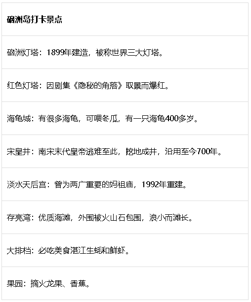 · 交通:湛江市東南碼頭搭渡輪,航程35分鐘,船票¥10