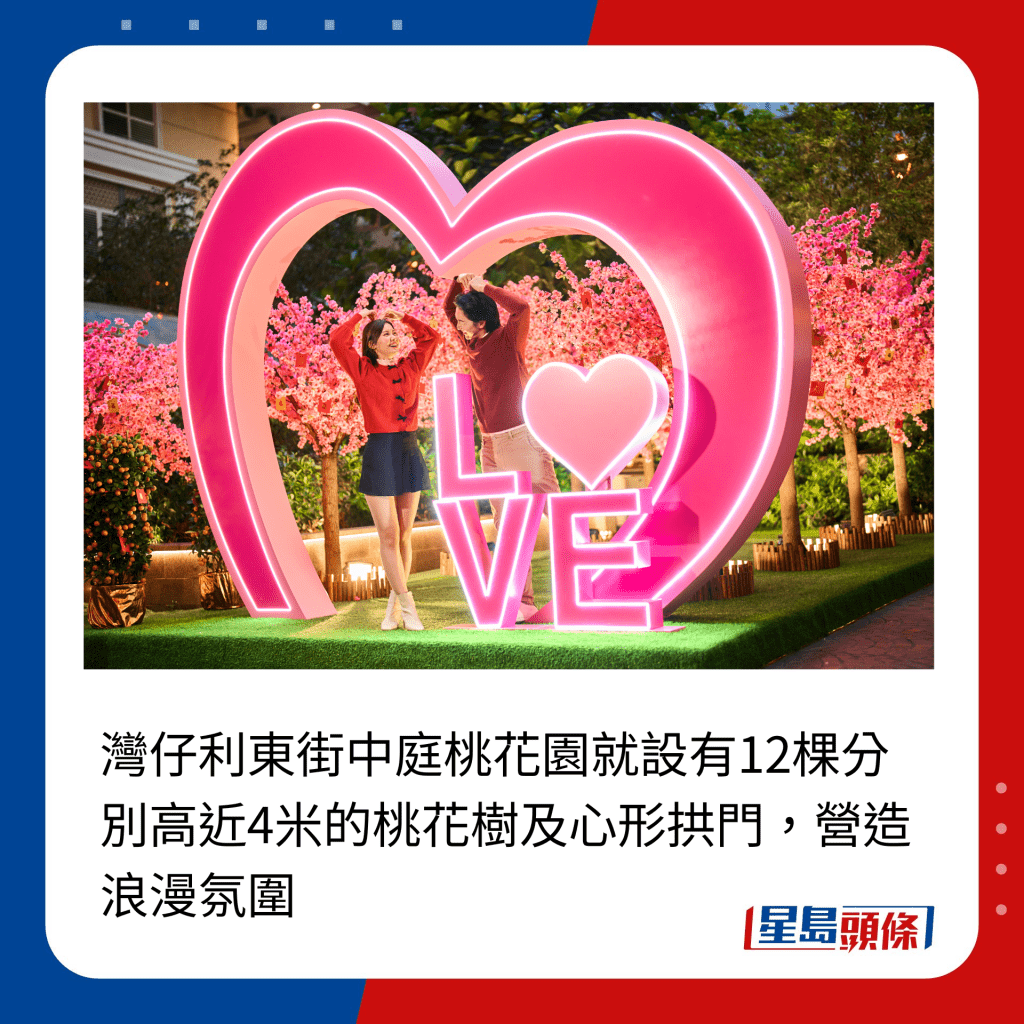 灣仔利東街中庭桃花園就設(shè)有12棵分別高近4米的桃花樹及心形拱門,營(yíng)造浪漫氛圍