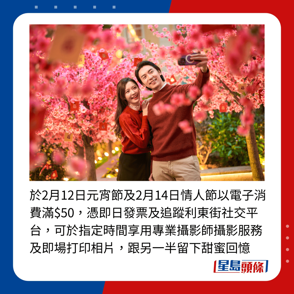于2月12日元宵節(jié)及2月14日情人節(jié)以電子消費(fèi)滿$50,憑即日發(fā)票及追蹤利東街社交平臺(tái),可于指定時(shí)間享用專業(yè)攝影師攝影服務(wù)及即場(chǎng)打印相片,跟另一半留下甜蜜回憶