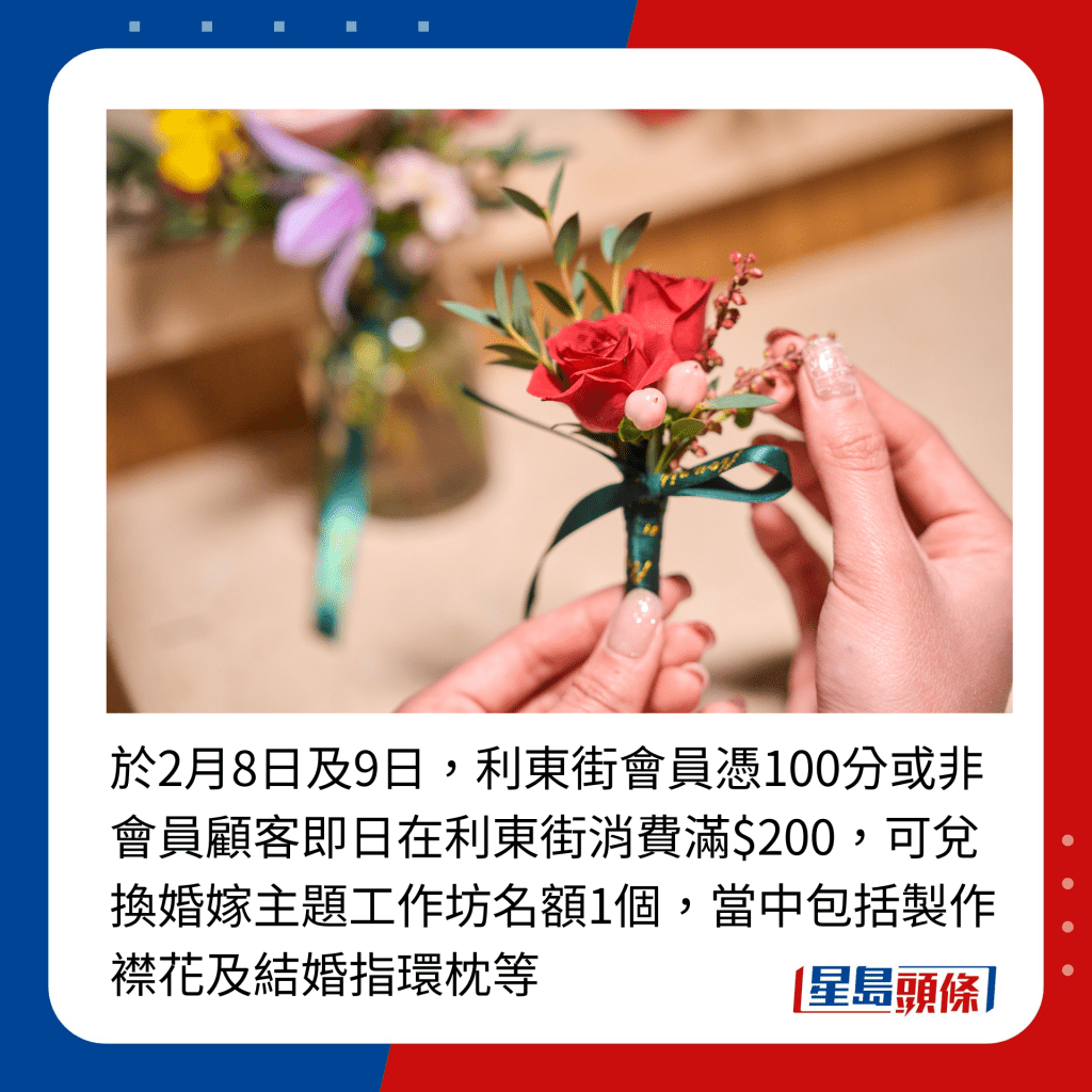 ▲于2月8日及9日,利東街會(huì)員憑100分或非會(huì)員顧客即日在利東街消費(fèi)滿$200,可兌換婚嫁主題工作坊名額1個(gè),當(dāng)中包括制作襟花及結(jié)婚指環(huán)枕等。