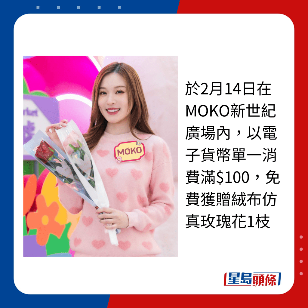 ▲于2月14日在MOKO新世紀(jì)廣場(chǎng)內(nèi),以電子貨幣單一消費(fèi)滿$100,免費(fèi)獲贈(zèng)絨布仿真玫瑰花1枝。