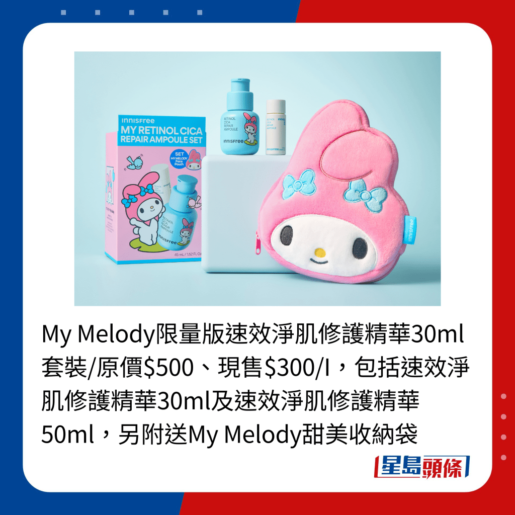 ▲My Melody限量版速效凈肌修護(hù)精華30ml套裝/原價(jià)$500、現(xiàn)售$300/I,包括速效凈肌修護(hù)精華30ml及速效凈肌修護(hù)精華50ml,另附送My Melody甜美收納袋。