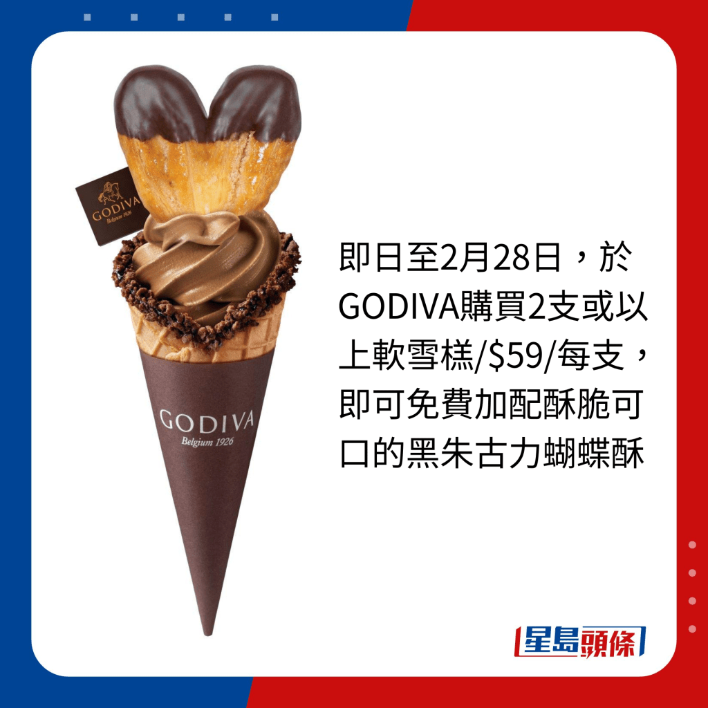 ▲即日至2月28日,于GODIVA購(gòu)買2支或以上軟雪榚/$59/每支,即可免費(fèi)加配酥脆可口的黑朱古力蝴蝶酥。