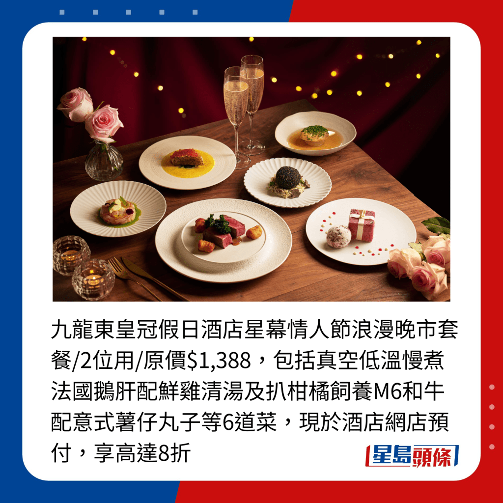▲九龍東皇冠假日酒店星幕情人節(jié)浪漫晚市套餐/2位用/原價(jià)$1,388,包括真空低溫慢煮法國(guó)鵝肝配鮮雞清湯及扒柑橘飼養(yǎng)M6和牛配意式薯仔丸子等6道菜,現(xiàn)于酒店網(wǎng)店預(yù)付,享高達(dá)8折。