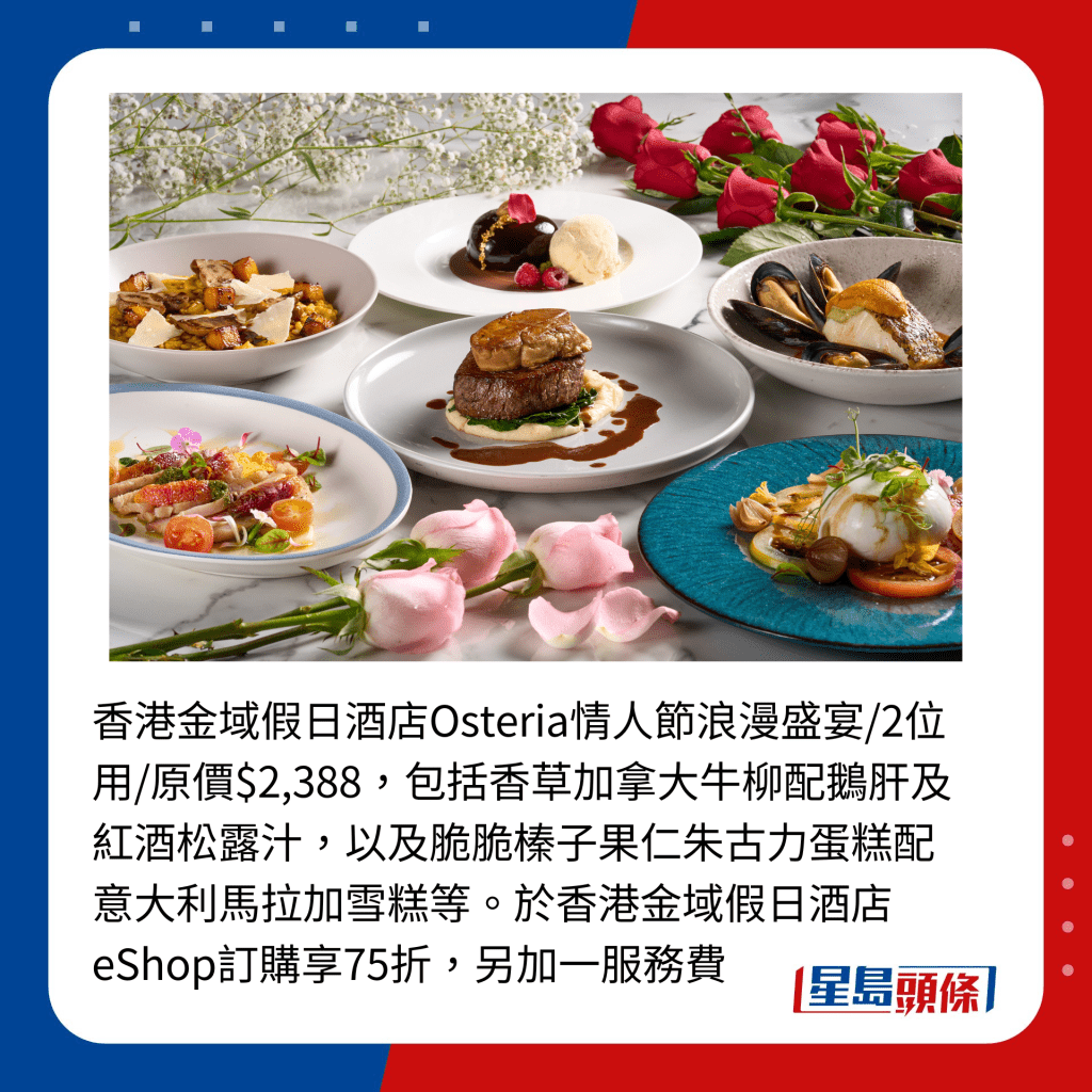 ▲香港金域假日酒店Osteria情人節(jié)浪漫盛宴/2位用/原價(jià)$2,388,包括香草加拿大牛柳配鵝肝及紅酒松露汁,以及脆脆榛子果仁朱古力蛋糕配意大利馬拉加雪糕等。于香港金域假日酒店eShop訂購(gòu)享75折,另加一服務(wù)費(fèi)。