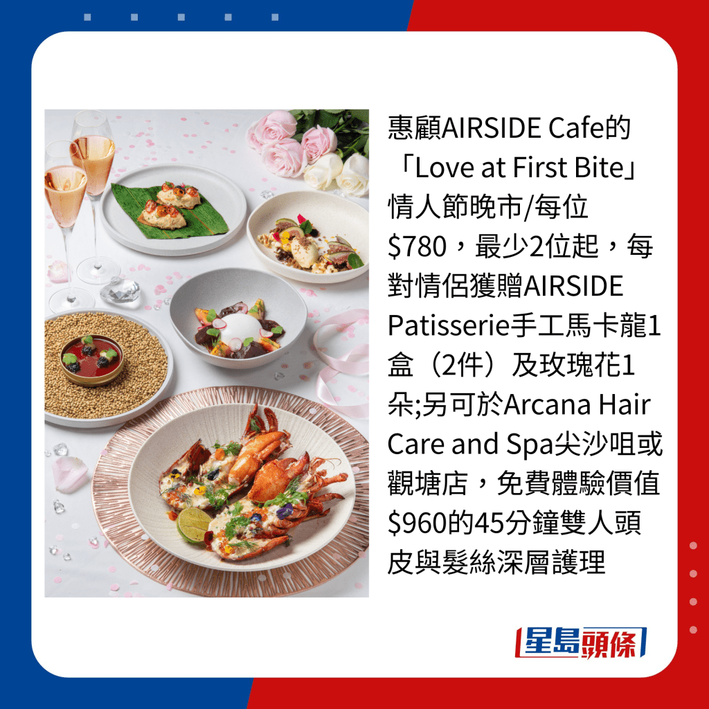 ▲惠顧AIRSIDE Cafe的“Love at First Bite”情人節(jié)晚市/每位$780,最少2位起,每對(duì)情侶獲贈(zèng)AIRSIDE Patisserie手工馬卡龍1盒(2件)及玫瑰花1朵; 另可于Arcana Hair Care and Spa尖沙咀或觀塘店,免費(fèi)體驗(yàn)價(jià)值$960的45分鐘雙人頭皮與發(fā)絲深層護(hù)理。