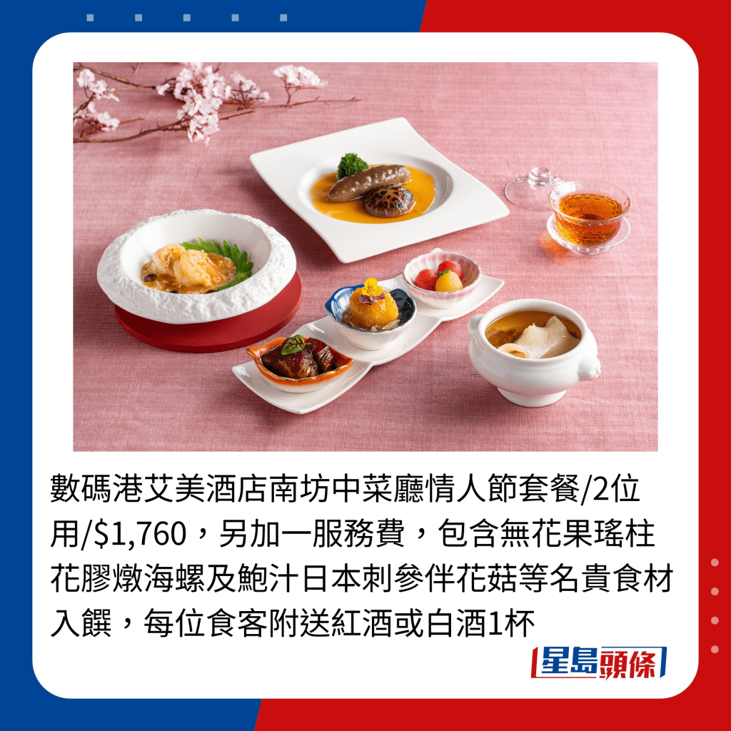 ▲數(shù)碼港艾美酒店南坊中菜廳情人節(jié)套餐/2位用/$1,760,另加一服務(wù)費(fèi),包含無花果瑤柱花膠燉海螺及鮑汁日本刺參伴花菇等名貴食材入饌,每位食客附送紅酒或白酒1杯。