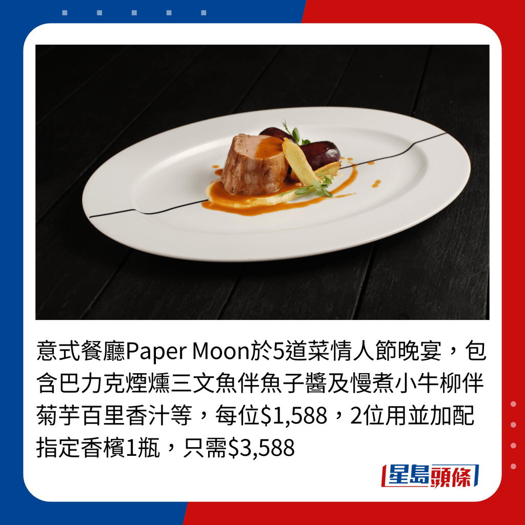 ▲意式餐廳Paper Moon于5道菜情人節(jié)晚宴,包含巴力克煙熗三文魚伴魚子醬及慢煮小牛柳伴菊芋百里香汁等,每位$1,588,2位用并加配指定香檳1瓶,只需$3,588。