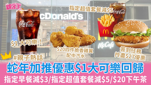 早前麥當勞推出50周年優(yōu)惠令一眾粉絲出盡法寶四處跟“麥當勞叔叔”打卡,還有50周年限定麻雀亦掀起全城搶購熱。 農(nóng)歷新年到了尾聲,麥當勞再推出重磅優(yōu)惠,震撼價$1大可樂強勢回歸之余,還有不同時段的指定套餐減$3及減$5優(yōu)惠、全新$20麥麥配下午茶優(yōu)惠等等,更有全新簽到任務,最高可攞盡$27優(yōu)惠,即睇各優(yōu)惠詳情。
