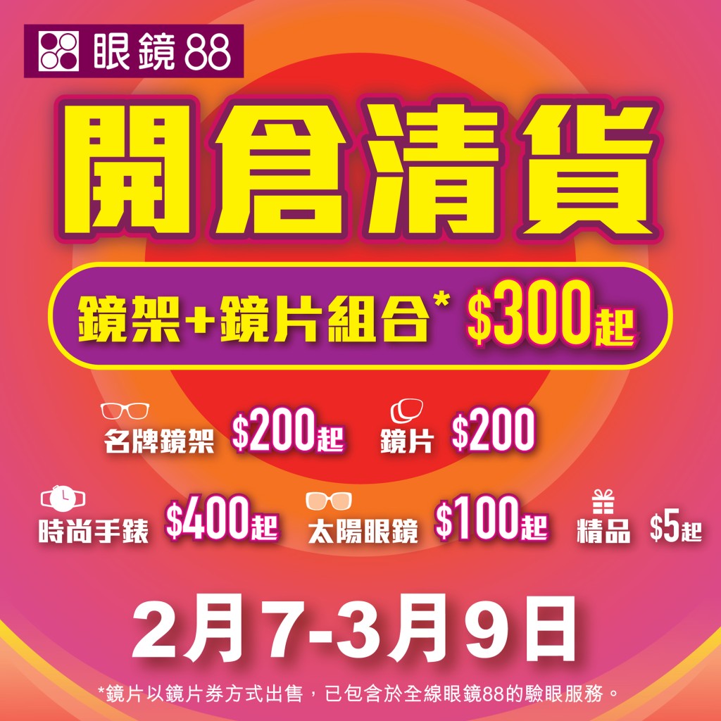 眼鏡88開(kāi)倉(cāng)清貨優(yōu)惠!低至$100,平過(guò)返深圳!