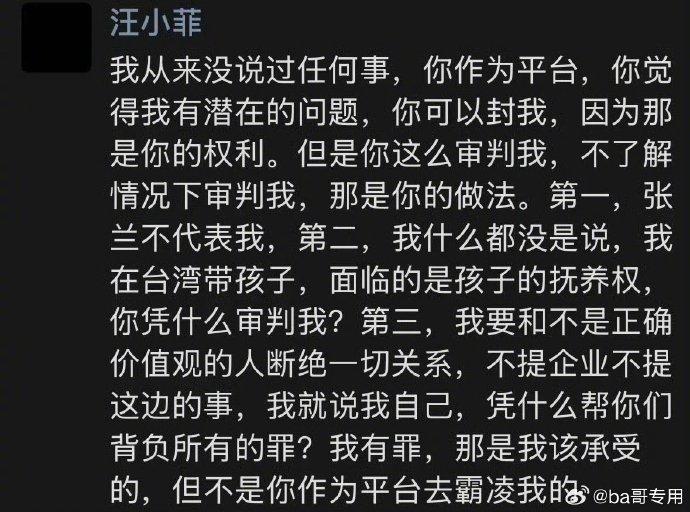 其后汪小菲在朋友圈直指,自己從來沒說過任何事,抖音作為平臺,覺得有潛在的問題,可以封他,因為那是平臺的權(quán)利?!暗悄氵@么審判我,不了解情況下審判我,那是你的做法?!苯又蔡岢?點,“第一,張?zhí)m不代表我。第二,我什么都沒說,我在臺灣帶孩子,面臨的是孩子的撫養(yǎng)權(quán),你憑什么審判我?第三,我要和不是正確價值觀的人斷絕一切關(guān)系,不提企業(yè)、不提這邊的事,我就說我自己,憑什么幫你們背負所有的罪?我有罪,那是我該承受的,但不是你作為平臺去霸凌我的”。網(wǎng)上更瘋傳汪小菲高喊“我不孝,但是絕對不能讓這種人獲得支持?!彼€稱吐露“她是我媽,可是我和她的三觀天地不合,我不是東西,我對不起所有人”接著就宣告“從今天起,我要和她斷絕所有關(guān)系”,更認為張?zhí)m賺得錢已夠活幾輩子。