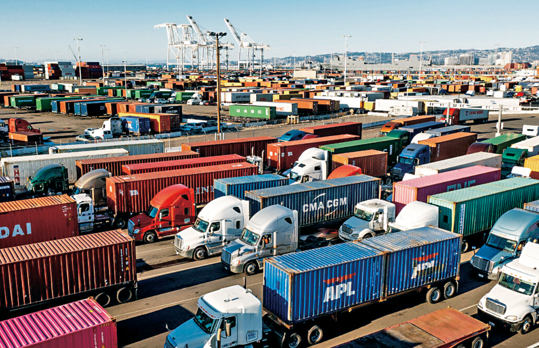 長隊等待進入港口的貨柜卡車。網頁截圖