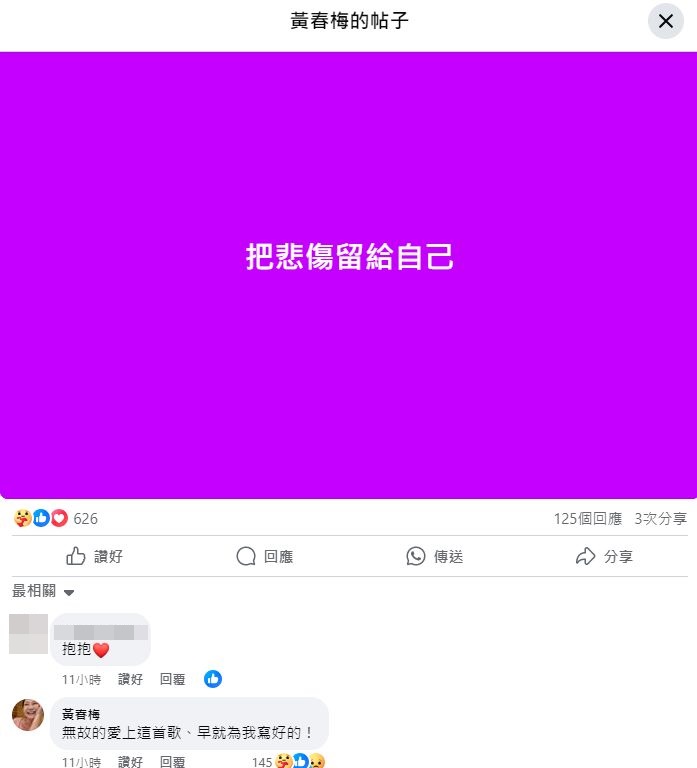 ▲S媽(黃春梅)昨日(10日)深夜11時(shí)許突然在社交網(wǎng)發(fā)文“把悲傷留給自己”,在留言區(qū)寫下“無故的愛上這首歌、早就為我寫好的!”