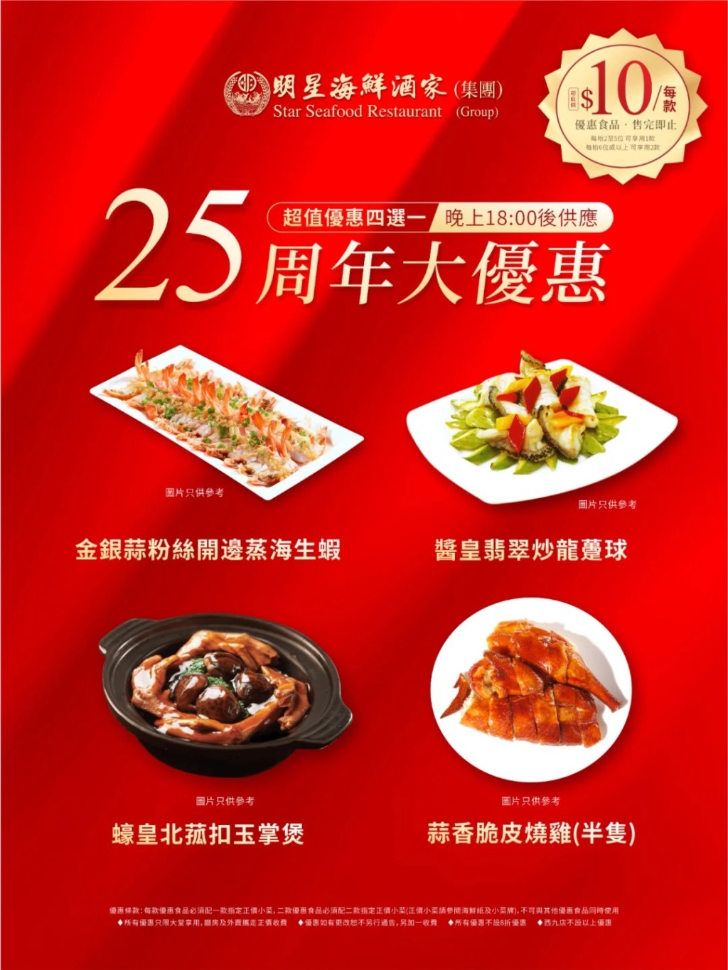 明星海鮮酒家以新鮮食材和精致烹調(diào)而聞名。為慶祝品牌創(chuàng)立25周年,酒樓更特別推出超值晚市優(yōu)惠,每晚6點(diǎn)后,粉絲蒸蝦、炒龍躉球、脆皮燒雞等四款精選小菜僅需$10,讓顧客以超優(yōu)惠價(jià)格享受高質(zhì)量美食!