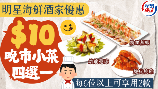 由即日起,只要于晚上6時(shí)后到訪明星海鮮酒家旗下分店(西九店除外)惠顧指定正菜,即可以優(yōu)惠價(jià)$10加購金銀蒜粉絲開邊蒸海生蝦、醬皇翡翠炒龍躉球、蠔皇北菇扣玉掌煲或蒜香脆皮燒雞(半只),每枱6位以上可享用2款。
