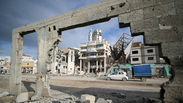 ▲加沙走廊大皇宮飯店(Grand Palace hotel)6日矗立于殘破的加薩市區(qū),街上空無(wú)一人。(路透)