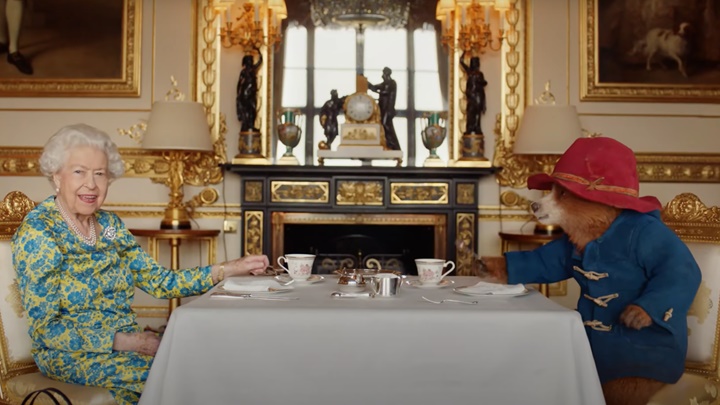 英女皇和柏靈頓熊在短片中,平起平坐嘆茶。