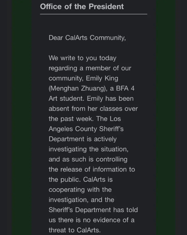 據(jù)知情人士透露,莊某某來自中國,是加州藝術(shù)學(xué)院(California Institute of the Arts)藝術(shù)系四年級學(xué)生。目前該校已經(jīng)發(fā)布她死亡的消息,并協(xié)助警方調(diào)查。