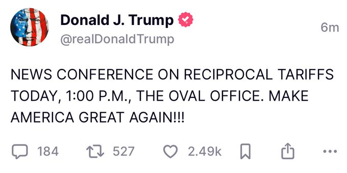 特朗普稍早前在旗下社交平臺(tái)Truth Social以全部大寫字母發(fā)文預(yù)告:“偉大的過去3星期,或許是有史以來最棒的,不過今天才是重頭戲:對(duì)等關(guān)稅!??!讓美國再次偉大!??!”