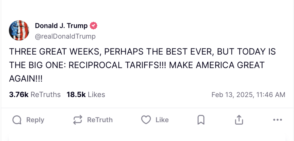 特朗普在旗下社交平臺(tái)真相社交以全部大寫字母發(fā)文說:”偉大的過去3星期,或許是有史以來最棒的,不過今天才是重頭戲:對(duì)等關(guān)稅!!讓美國再次偉大!!“