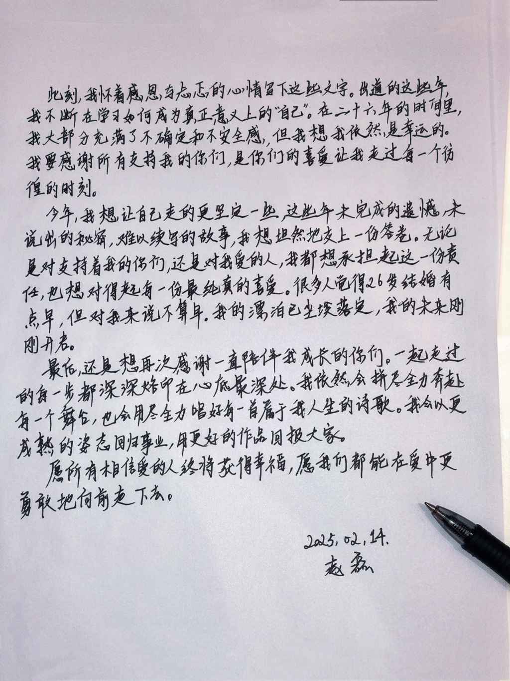 最后,趙磊再度感謝一路陪伴他成長的粉絲,婚后他會用更成熟的姿態(tài)回歸事業(yè),依舊在舞臺上全力以赴,也會用盡全力唱好每首歌。