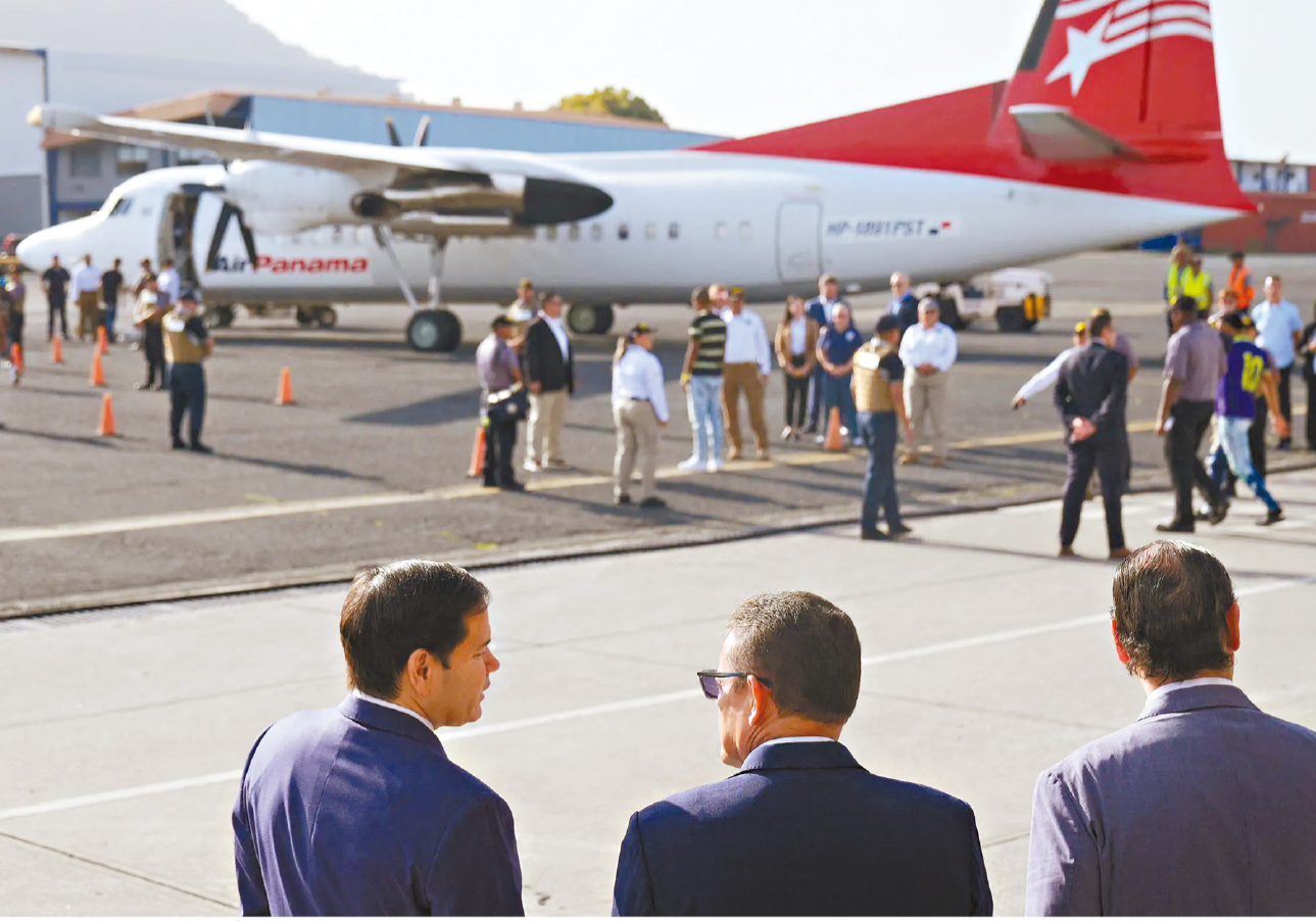 圖為美國(guó)國(guó)務(wù)卿魯比奧(左)日前在巴拿馬城機(jī)場(chǎng)查看從美國(guó)遣返移民的航班。 法新社資料圖片