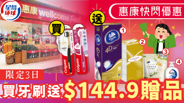 惠康優(yōu)惠|超市買高露潔牙刷送$144.9日用品!維達(dá)4D廁紙/洗衣球/洗手液
