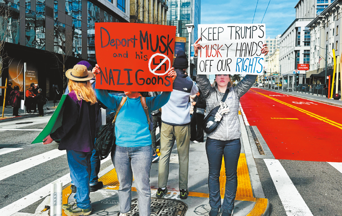 灣區(qū)總統(tǒng)日爆發(fā)抗議行動(dòng),諷刺特朗普馬斯克朋比為奸