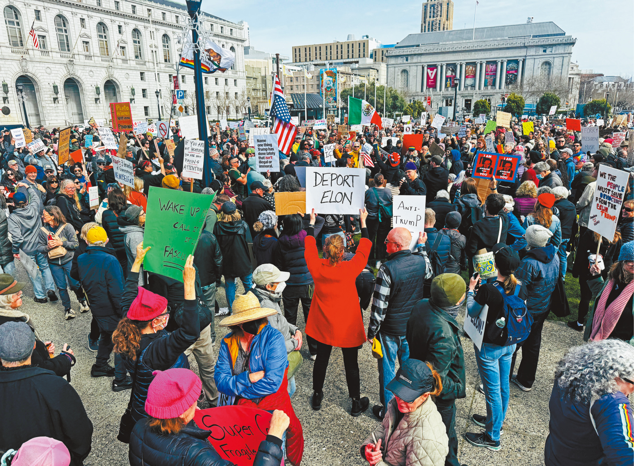 舊金山的抗議活動(dòng)在17日中午舉行,數(shù)百名示威者聚集市政廳前,舉著“不要獨(dú)裁者”、“反對(duì)特朗普與馬斯克”等各式標(biāo)語(yǔ),要求國(guó)會(huì)采取行動(dòng)。現(xiàn)場(chǎng)有各式旗幟,包括美國(guó)國(guó)旗、加州旗、墨西哥國(guó)旗、巴勒斯坦國(guó)旗、彩虹旗和性小眾旗等,表達(dá)對(duì)各種議題的訴求??棺h組織者強(qiáng)調(diào),這場(chǎng)行動(dòng)不僅是針對(duì)馬斯克與特朗普,更是對(duì)整個(gè)政府削弱民主機(jī)制的憂慮。