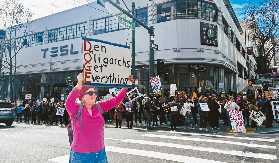 另一批數(shù)百名示威者同時(shí)段在Van Ness大道上的特斯拉展示中心外,抗議馬斯克作為特朗普政府的關(guān)鍵人物,推動(dòng)削減聯(lián)邦預(yù)算與解雇公務(wù)員。