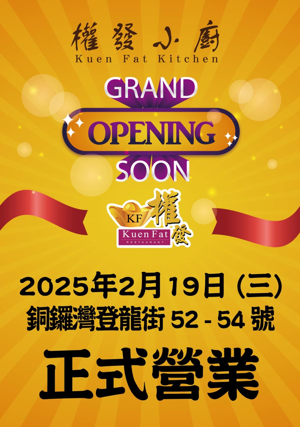 權(quán)發(fā)小廚價格親民,每日供應(yīng)多款菜式,深受市民歡迎,在短短數(shù)年間,一躍成香港兩餸飯店的龍頭,每逢繁忙時段,店門外都必定會出現(xiàn)人龍排隊幫襯。繼油麻地、佐敦及觀塘分店,權(quán)發(fā)小廚于月前在社交平臺上宣布店鋪將進駐港島區(qū),選址銅鑼灣登龍街一地鋪,于今日(2月19日)起試業(yè),而正式開業(yè)的日子則定3月5日(三)。