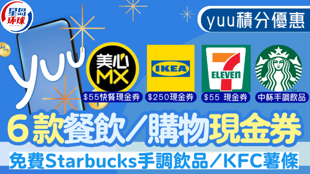 yuu積分優(yōu)惠|7-11/IKEA/美心無消費(fèi)門檻電子現(xiàn)金券+免費(fèi)Starbucks咖啡/KFC薯?xiàng)l/美心干炒牛河