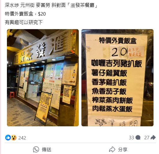 日前,有網(wǎng)民于社交平臺(tái)Facebook“荃灣人”群組發(fā)文,分享發(fā)現(xiàn)深水埗一間茶餐廳的外賣飯盒只售$20!從圖中所見(jiàn),位于深水埗元州街、正對(duì)著麥當(dāng)勞的“匯發(fā)茶餐廳”,推出特價(jià)外賣飯盒,每款僅售$20。特價(jià)外賣飯盒有多達(dá)6款可供選擇,包括咖喱吉列豬扒飯、薯仔雞翼飯、香茅雞扒飯、魚(yú)香茄子飯、榨菜蒸肉餅飯及肉松蒸水蛋飯。