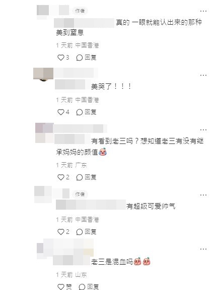 有網(wǎng)民就留言指當日在大型玩具店遇見栢芝,估計她正在買玩具給兒子:“一看她眉毛就認出來是她,超有辨識度。昨(前)天小孩玩玩具車剛好撞到她的鞋,上次在小區(qū)會所也看到她過來健身!整個人超美啊! ”樓主也大表認同,直指張栢芝美到令人窒息,但其他網(wǎng)民似乎對其兒子更有興趣,留言問道:“有看到老三嗎?想知道老三有沒有繼承媽媽的顏值”,樓主即回覆:“有!超可愛帥氣”,但當有人問到“老三是混血嗎”、“像不像謝霆鋒啊”等問題,她就未有回覆。