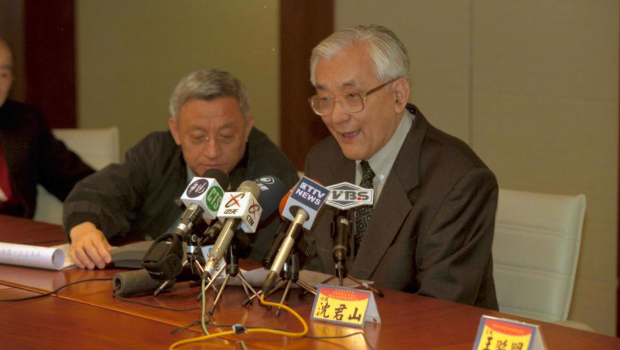 ▲圖為2000年4月臺北市第1屆兩岸名流網絡圍棋對抗賽,已故前的臺灣清大校長沈君山(右)、曹興誠(左)曾聯(lián)袂參與。中時資料照