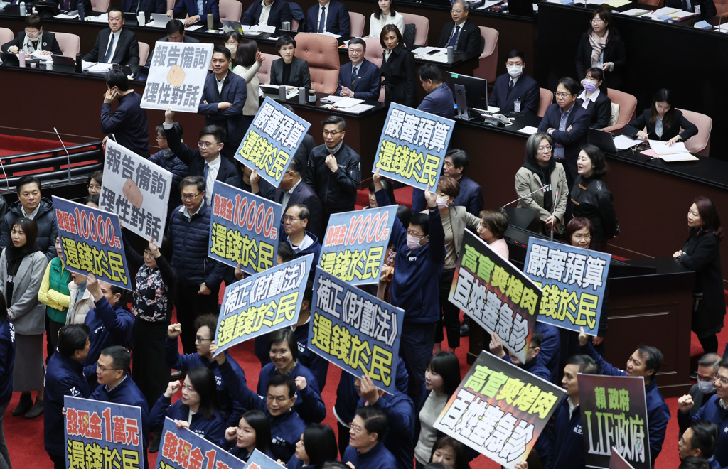 國(guó)民黨“立委”手持“嚴(yán)審預(yù)算,還錢于民”等標(biāo)語(yǔ)抗議。