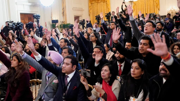 ▲圖為13日美國(guó)總統(tǒng)特朗普在白宮會(huì)晤印度總理莫迪時(shí),現(xiàn)場(chǎng)媒體工作畫(huà)面。(路透社)