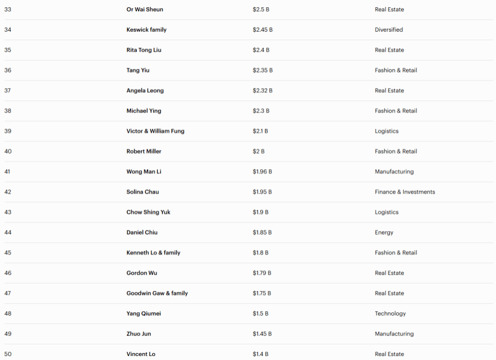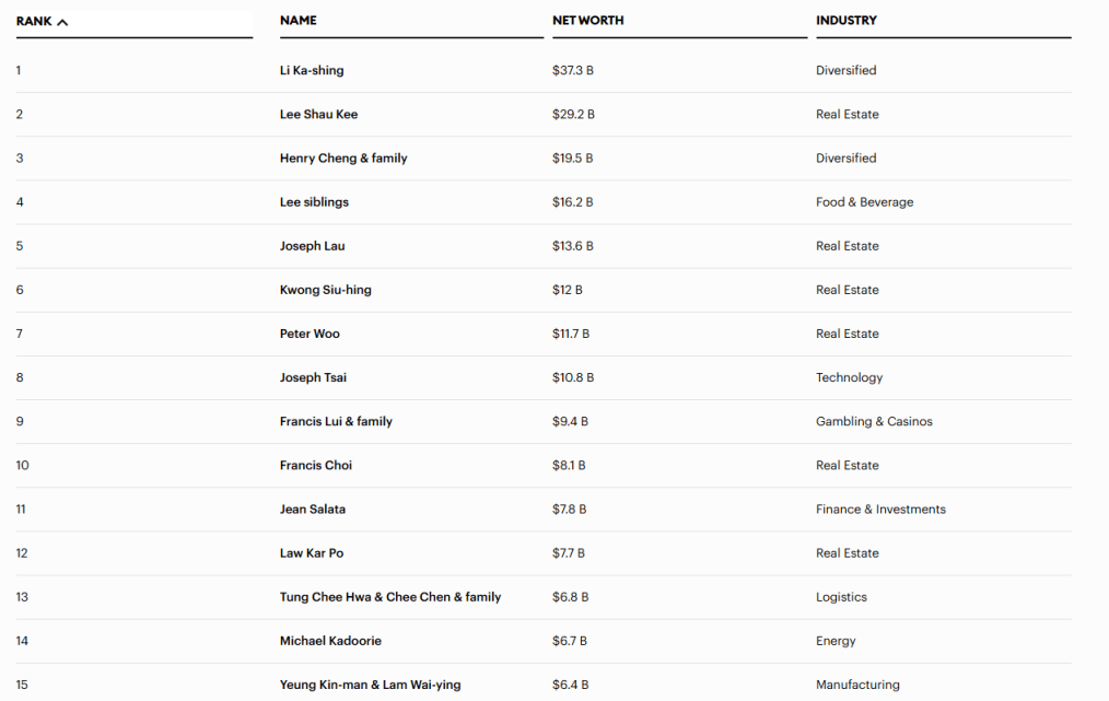 福布斯香港50大富豪榜名單︰