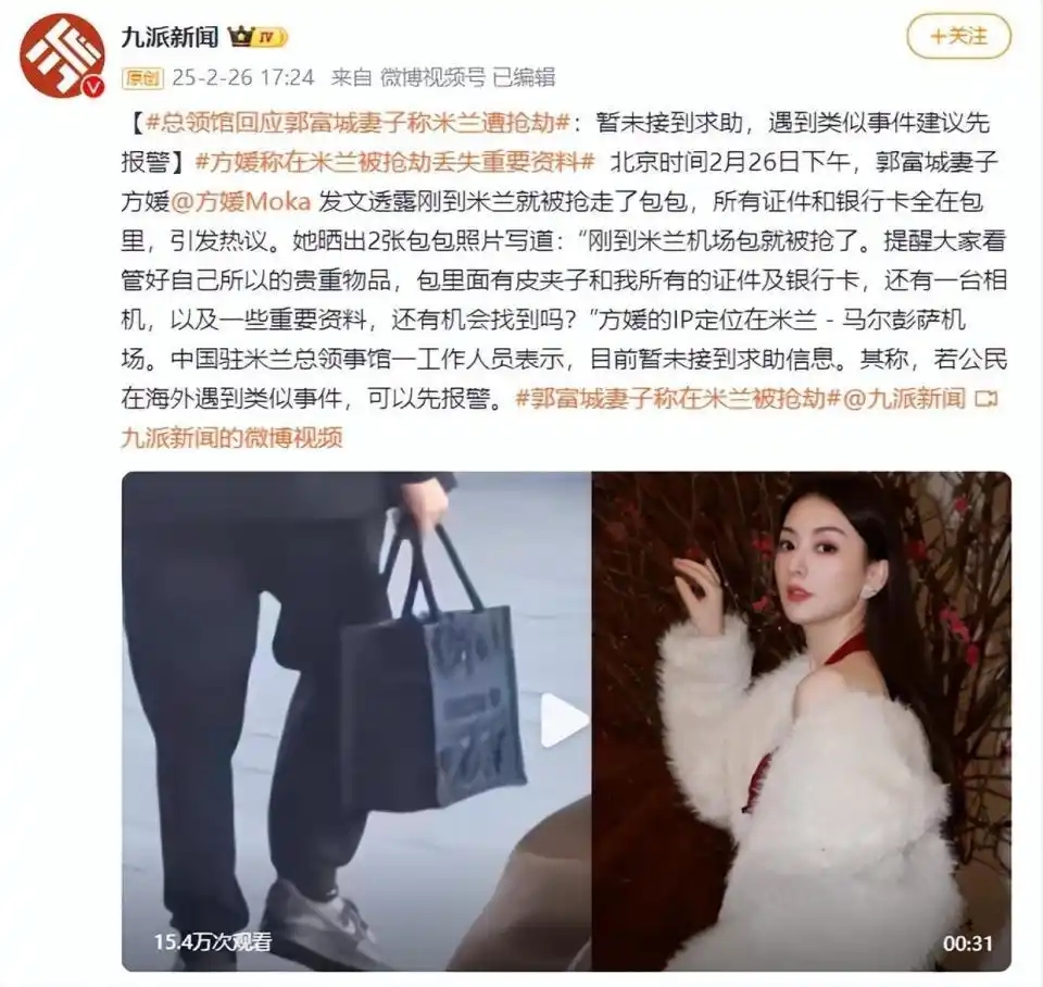 2月26日下午,郭富城妻子方媛發(fā)文透露剛到米蘭就被搶走了包包。