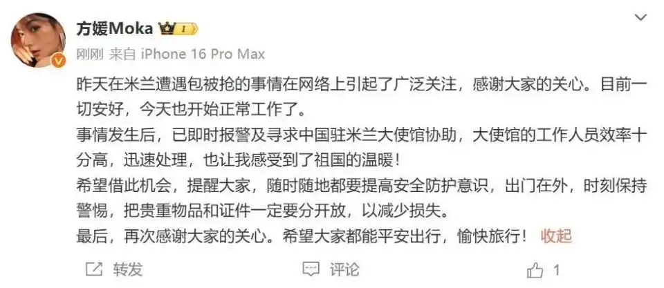 方媛還提醒網(wǎng)友隨時(shí)隨地都要提高安全防護(hù)意識(shí),“出門在外,時(shí)刻保持警惕,把貴重物品和證件一定要分開放,以減少損失。最后,再次感謝大家的關(guān)心。希望大家都能平安出行,愉快旅行!”