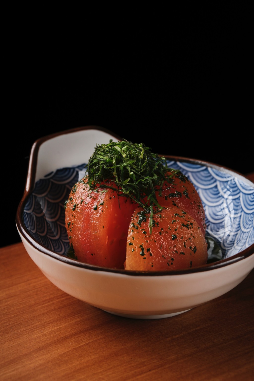 賣(mài)相吸睛的蝦味噌南瓜,是以特別的烹技,把日式味噌預(yù)先經(jīng)過(guò)烘焙和發(fā)酵,伴上南瓜凸顯其特有的甜味,再配自制的蝦子忌廉,吃起來(lái)滑溜及有不同層次的鮮味。將日式開(kāi)胃前菜重新炮制的紫蘇番茄,利用酸醋與麥芽糖浸漬新鮮的法國(guó)番茄,味道清新爽口。