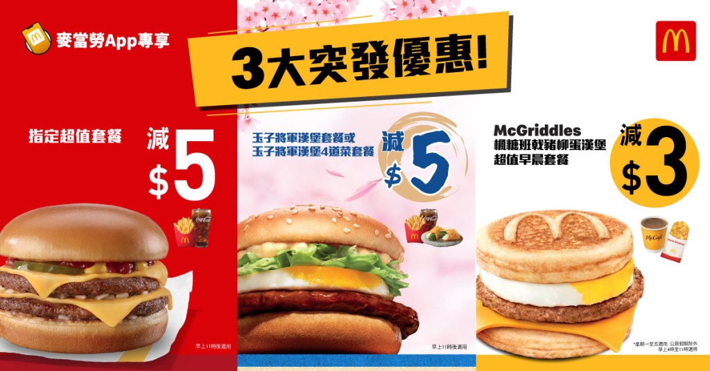 麥當(dāng)勞優(yōu)惠|即日起,麥當(dāng)勞 App 再次帶來三款超值突發(fā)優(yōu)惠!各款超值套餐大減 $5、玉子將軍漢堡套餐減 $5,McGriddles 早晨套餐亦可減 $3,從早餐到晚餐,全天候享受超抵的美味時(shí)光!