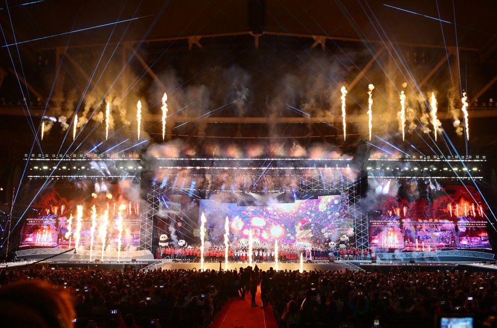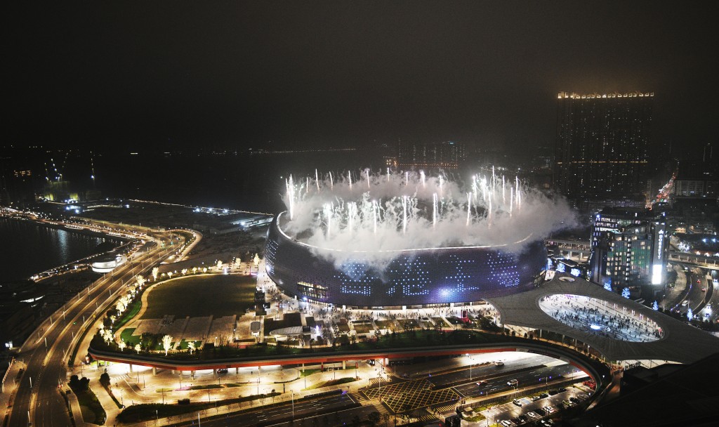啟德主場館在開幕表演尾聲進(jìn)行煙火表演。