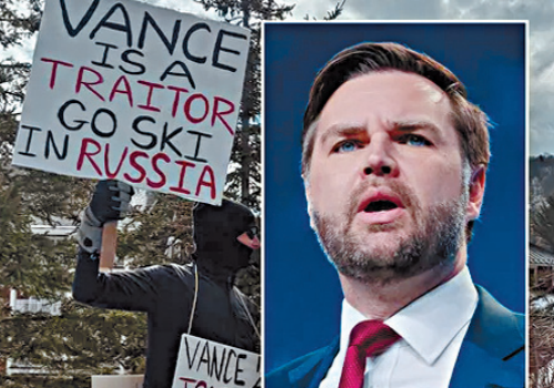 綜合霍士新聞與英國(guó)《衛(wèi)報(bào)》報(bào)道,數(shù)百名示威者1日集結(jié)在佛蒙特州沃倫市(Warren)的滑雪度假村,半哩長(zhǎng)的人鏈中出現(xiàn)不同標(biāo)語(yǔ),指責(zé)萬(wàn)斯是“叛徒”、“納粹敗類(lèi)”,與總統(tǒng)特朗普一起向俄羅斯總統(tǒng)普京獻(xiàn)媚,因此應(yīng)去俄羅斯滑雪。