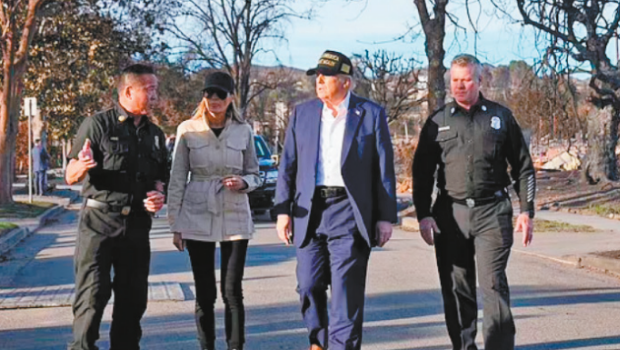 ▲總統(tǒng)特朗普以杜絕山火隱患為由,在行政命令中要求聯(lián)邦加快啟動森林管理計劃,圖為他早前到洛杉磯視察災(zāi)情。 美聯(lián)社