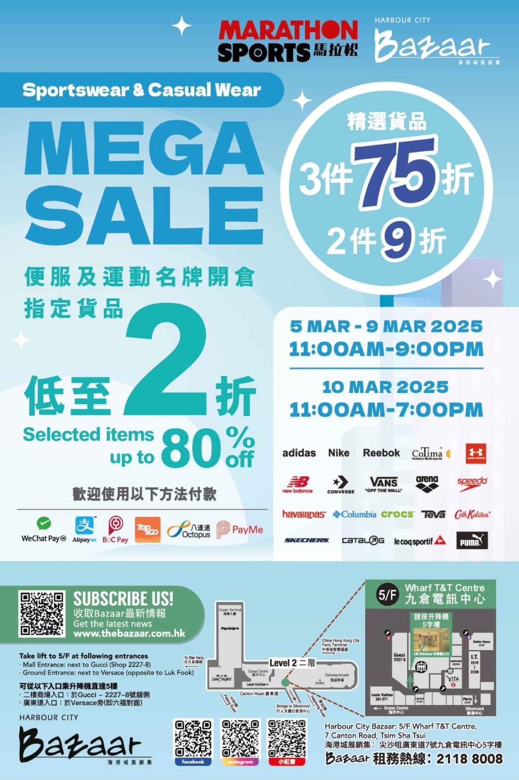 馬拉松(Marathon Sports)及意大利休閑服飾品牌GEOX由即日起至3月10日,于尖沙咀海港城九倉電訊中心舉行限定一連6日的展銷會,有大量運(yùn)動品牌特價貨品發(fā)售,包括adidas、Nike、Reebok、New Balance、Converse、Columbia、VANS、crocs及puma等品牌的休閑服飾、便服、鞋款、襪及配件等,低至2折,部分更減至$20,非常抵買!加上有多買多減優(yōu)惠,精選貨品買2件額外有9折及買3件75折優(yōu)惠。